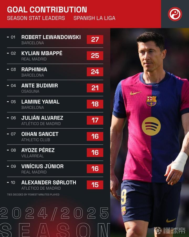 2024/25赛季西甲联赛直接参与进球数排行榜(截至4月25日)